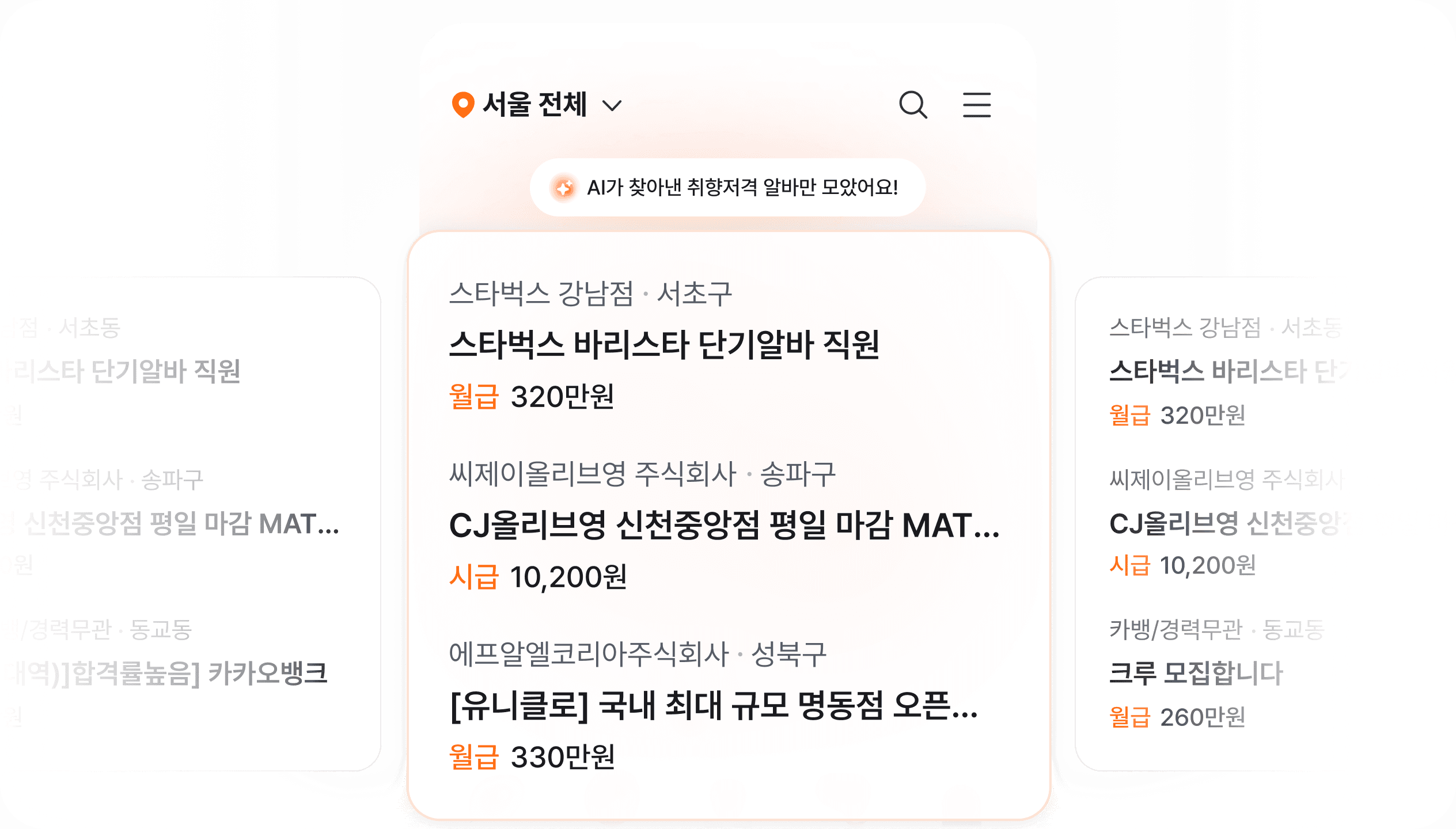 근무 시간, 위치, 급여, 선호 조건 등 실제 일하는 맥락을 반영해 딱 맞는 알바 기회를 우선적으로 추천합니다. 반복적인 검색 없이도 다양한 상황에 맞는 알바를 빠르게 발견할 수 있습니다.