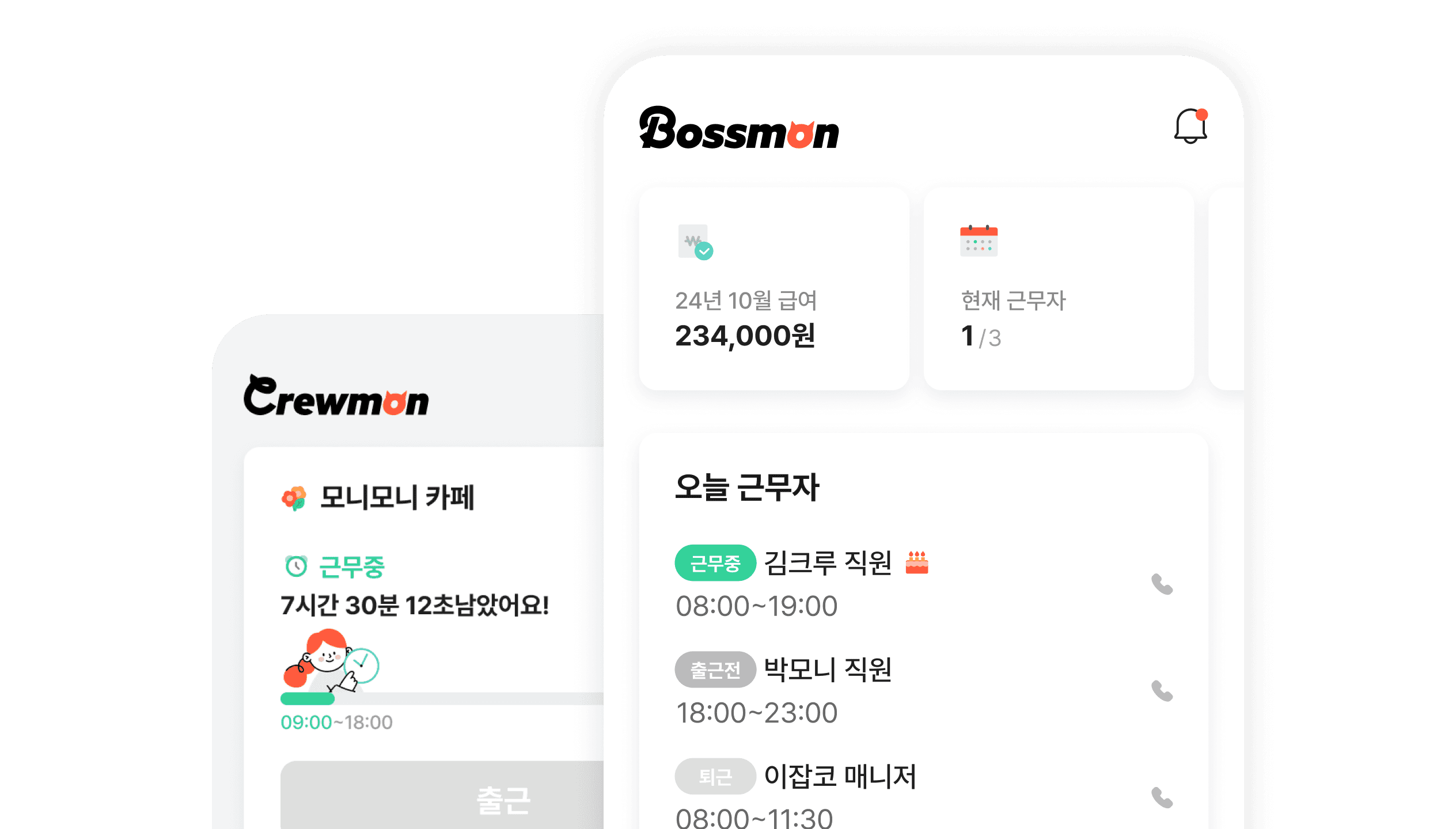 출퇴근 기록, 스케줄표, 근로계약서, 급여 계산서를 하나의 서비스로 통합했습니다. 별도의 엑셀 관리나 종이 문서 없이도 알바 관리에 필요한 업무를 보스몬 안에서 처리할 수 있습니다.