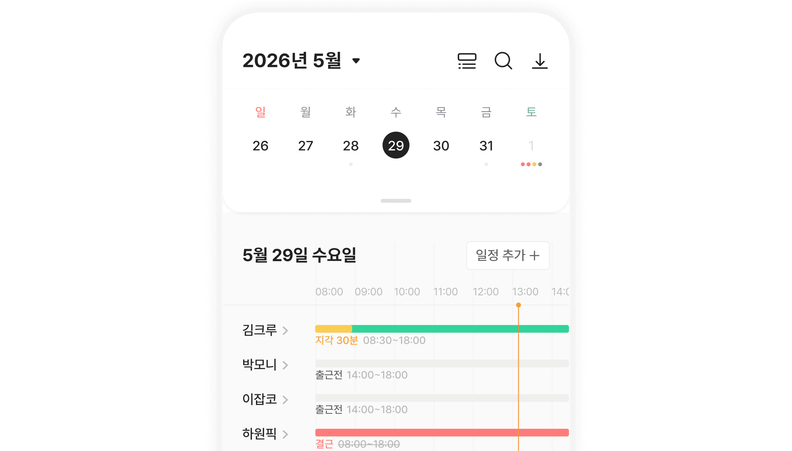 보스몬은 직원과 함께 실시간으로 기록을 관리하고 공유할 수 있는 현장 중심 관리 방식을 제공합니다. 직원은 앱을 통해 직접 출퇴근을 등록하고 근태기록 변경을 요청할 수 있습니다.
