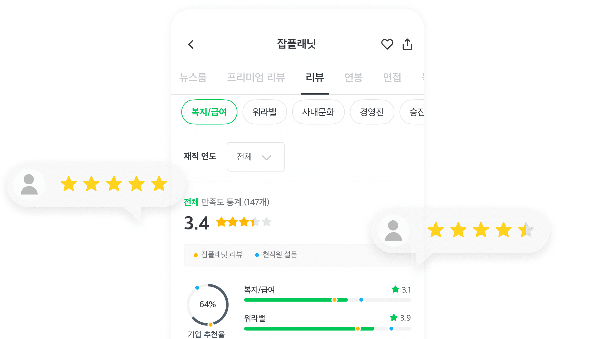 연봉, 복지, 조직문화, 면접 경험 등 채용 공고만으로는 알기 어려운 정보를 바탕으로 기업을 입체적으로 이해하도록 돕습니다.