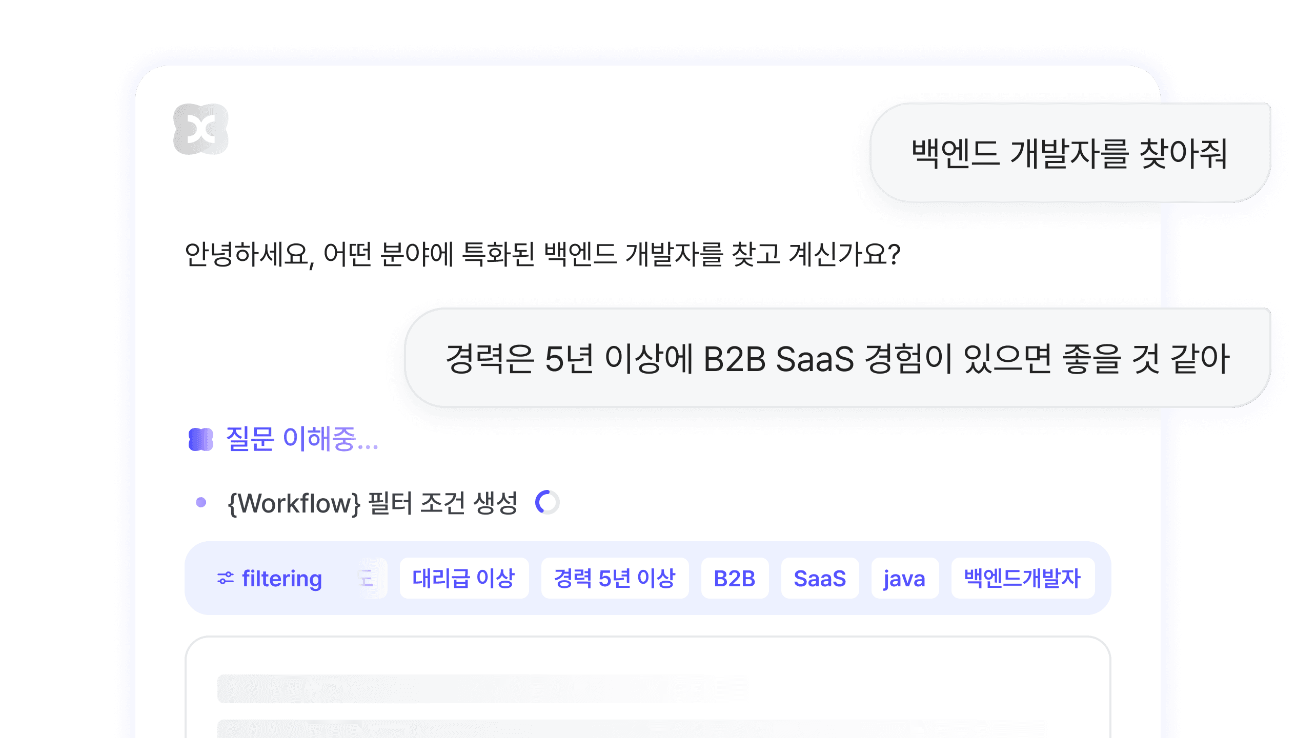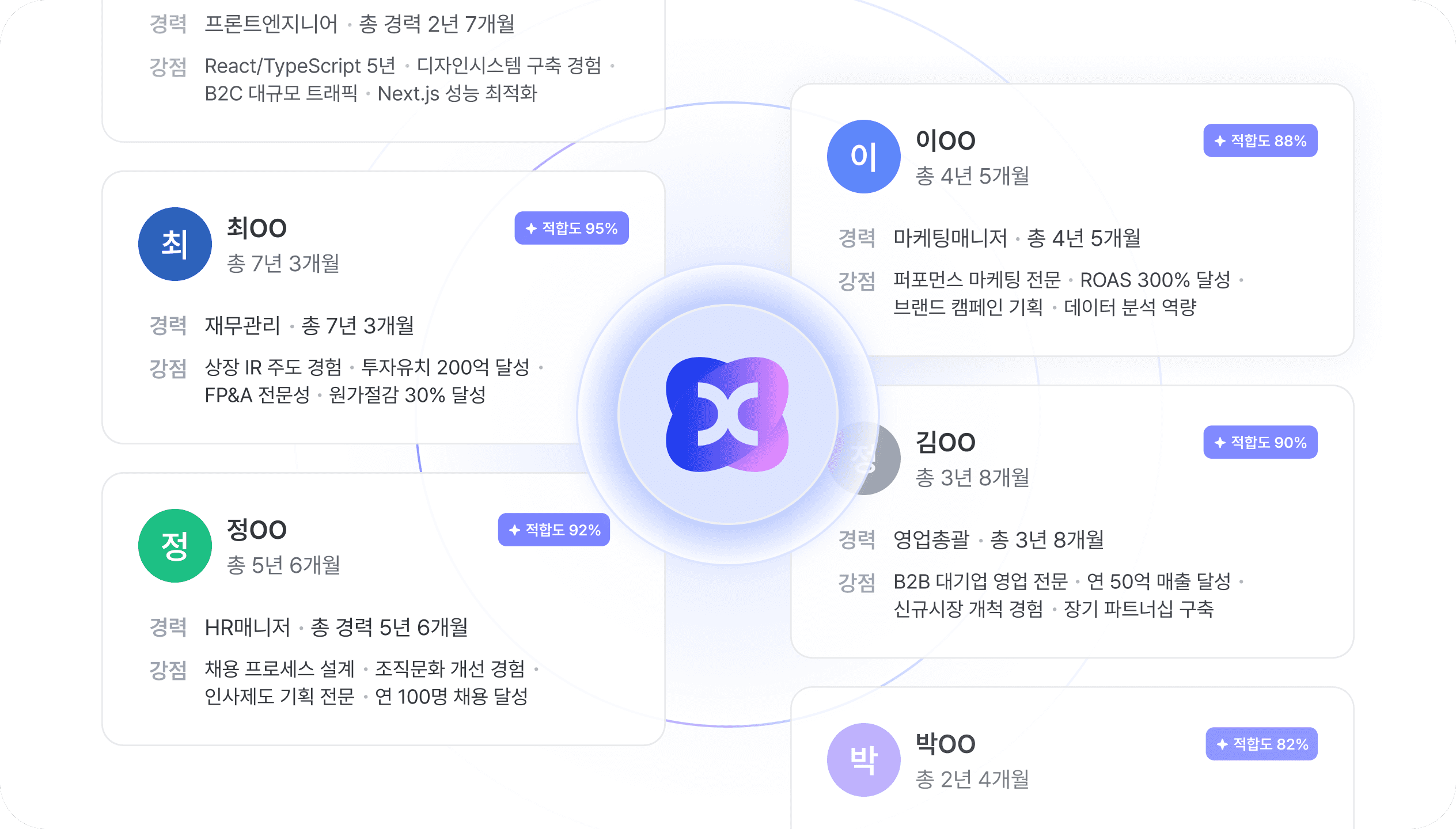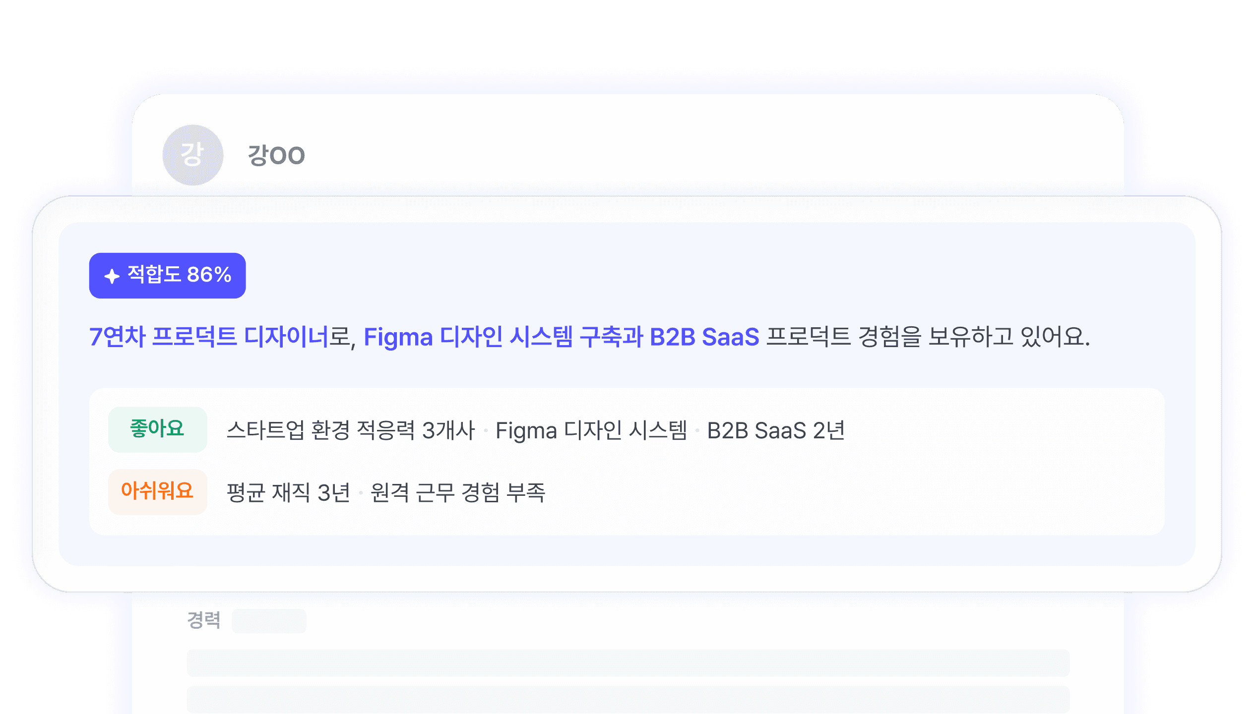몇 번의 대화만으로 채용 상황에 맞는 후보군이 빠르게 정리되고, 필요한 후보만 남길 수 있습니다. 후보의 강점과 역할 맥락을 함께 제시해 채용 판단이 쉬워지고 내부 설득도 빨라집니다.